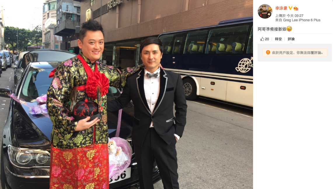 【now.com】藝人李家鼎大仔李泳漢今日與拍拖兩年的圈外女友嚴佩鈺(Conny)拉埋天窗。今早李泳漢就穿上傳統中式禮服,戴上彩球同一班兄弟團現身九龍城接新娘,當中梗係有弟弟李泳豪喇!