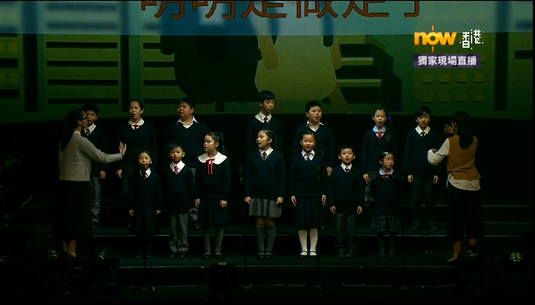 繁忙兒童合唱團唱出學生考TSA的心聲。(now TV畫面)