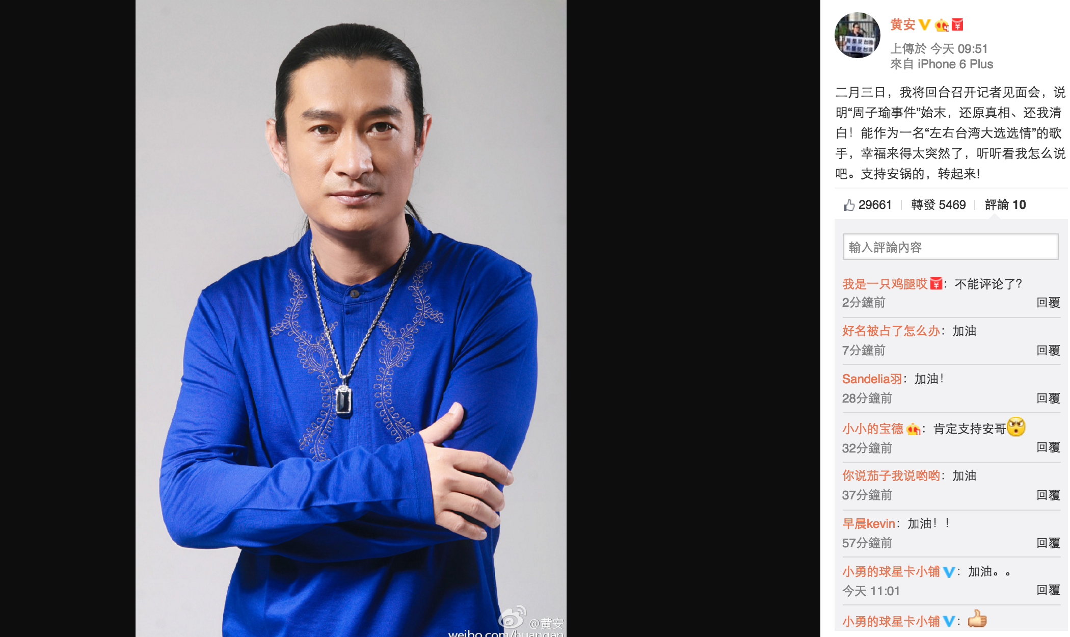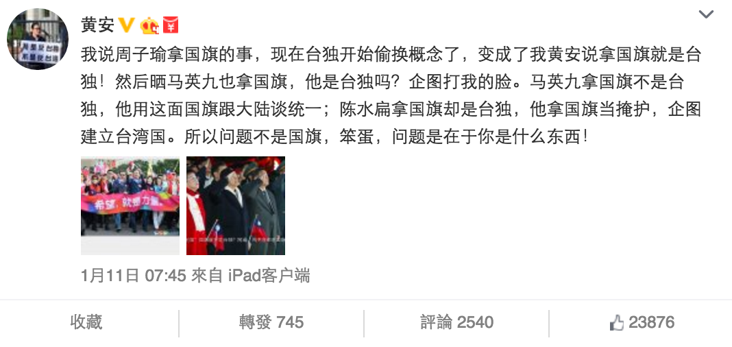 昨日台灣總統大選,民進黨蔡英文以689萬票成為台灣首位女總統,令台灣步入新時代。不少人都認為部分原因是因為黃安近日在微博上發文不斷「脅迫」周子瑜,激發選民投票熱情,導致蔡英文順利大勝。今日早上黃安在微博貼出相片,又留言表示會於下月舉行記招,向大家講明「周子瑜事件」,又大呼要「還我清白」,他說:「二月三日,我將回台召開記者見面會,說明『周子瑜事件』始末,還原真相、還我清白!能作為一名『左右台灣大選選情』的歌手,幸福來得太突然了,聽聽看我怎麼說吧。」又叫支持他的Fans在微博轉發訊息。