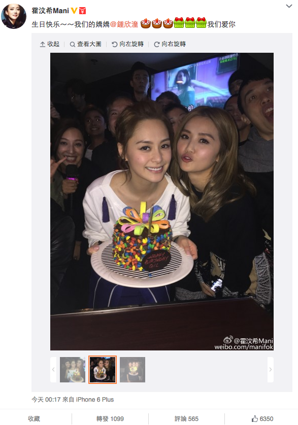與阿嬌共同進退多年的阿Sa,在微博貼上咀嘴阿嬌面頰相片並留言說:「我最愛的妳生日快樂,鍾欣潼,永遠幸福。」經理人霍汶希(Mani)亦在微博晒出阿嬌捧著生日蛋糕的相片,並送上祝福說:「生日快樂~我們的嬌嬌」身為「龍虎豹」首領的Joey更以「小公主」在Instagram向壽星女送祝福,又貼上一張咀嘴相片說:「Happy birthday to my little princess(我的小公主生日快樂)」