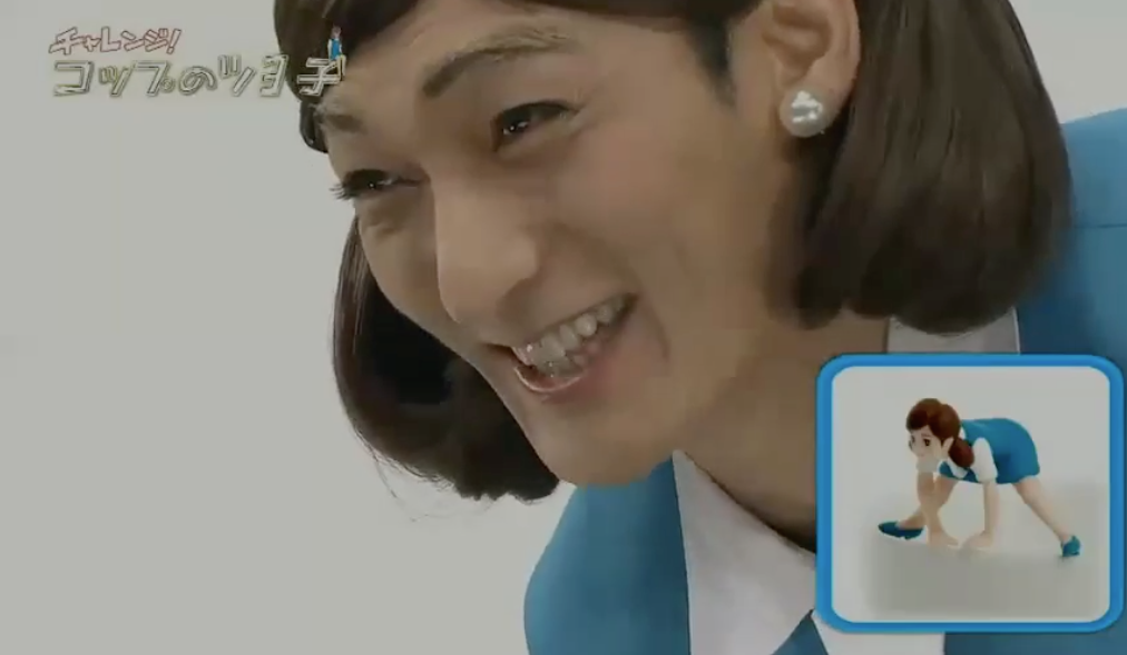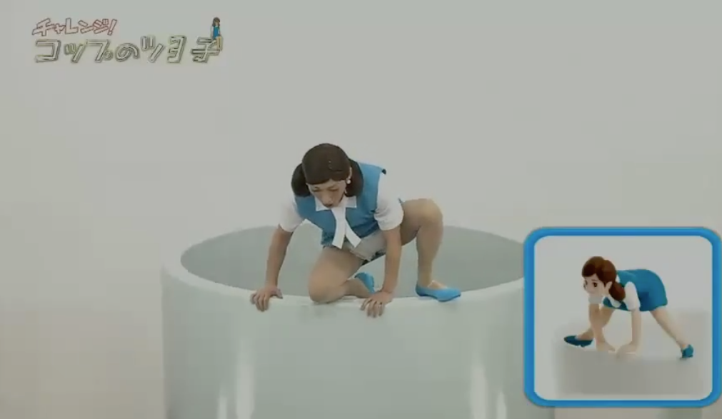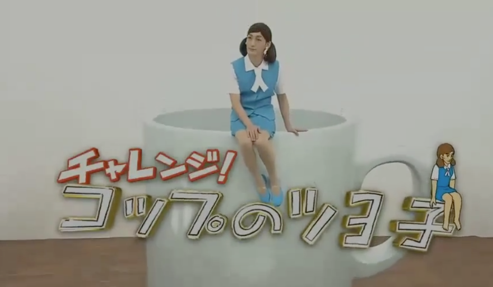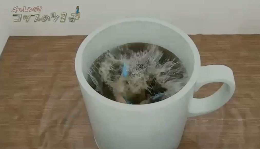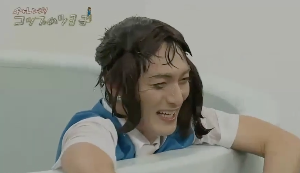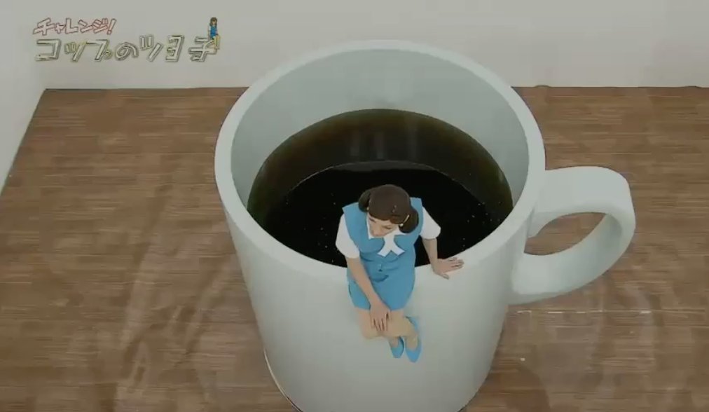 節目製作單位先造出一個巨大咖啡杯,杯中裝滿黑色的水,以一副杯緣子OL look兼戴上假髮示人的草彅剛坐在杯邊,隨即要擺出杯緣子多個高難度不同動作,並要維持5秒時間。起初草彅剛做出擘脾及拱橋等都尚算成功,但做動作期間卻頻頻露出白色打底褲,認真搞笑!最後草彅剛在凌空擘腿動作中失平衡跌落水中,慘變「落湯雞」,最後他狼狽地爬起身對鏡頭說「水很溫暖」,網友都大讚草彅剛專業。