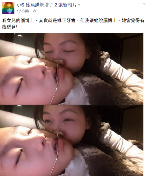 小S將親吻大囡的相片放到Facebook,見到大囡戴著維持器睡覺,狀甚痛苦,小S更留言說:「我女兒的腦博士,其實就是矯正牙齒,但我跟她說腦博士,她會覺得有趣很多!」照片一出,不少網友就被嚇倒,更留言以為大囡是小S的蠟像,引起網友一陣討論。