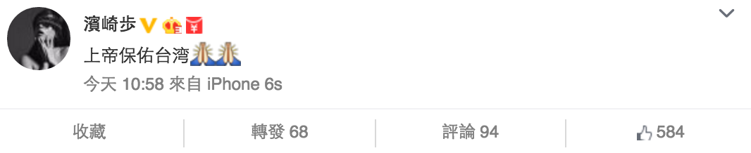 事件更觸動到日本,濱崎步亦都在微博送上祝福。(微博截圖)