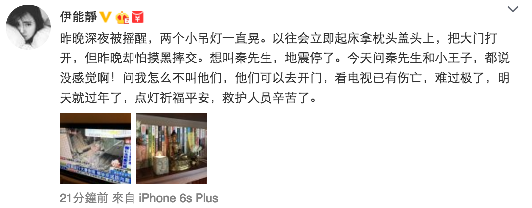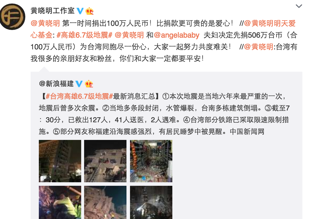台灣於除夕前發生地震,救援工作正全力進行中,兩岸三地藝人紛紛於社交網絡留言祝福,黃曉明透過其工作室的微博表示立即捐出100萬人民幣賑災,他說:「決定先捐506萬台幣(合100萬人民幣)為台灣同胞盡一份心,大家一起努力共度難關!」又祈求台灣的親朋好友要平安。腹大便便的伊能靜就在微博表示自己深夜被地震搖醒,她說:「昨晚深夜被搖醒,兩個小吊燈一直晃。以往會立即起床拿枕頭蓋頭上,把大門打開,但昨晚卻怕摸黑摔交。想叫秦先生(秦昊),地震停了。今天問秦先生和小王子,都說沒感覺啊!問我怎麼不叫他們,他們可以去開門,看電視已有傷亡,難過極了,明天就過年了,點燈祈福平安,救護人員辛苦了。」