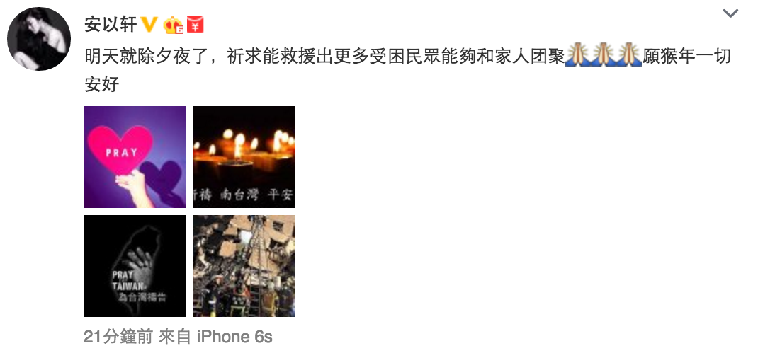 台灣藝人安以軒就在微博向台南的朋友送上祝福。(微博截圖)