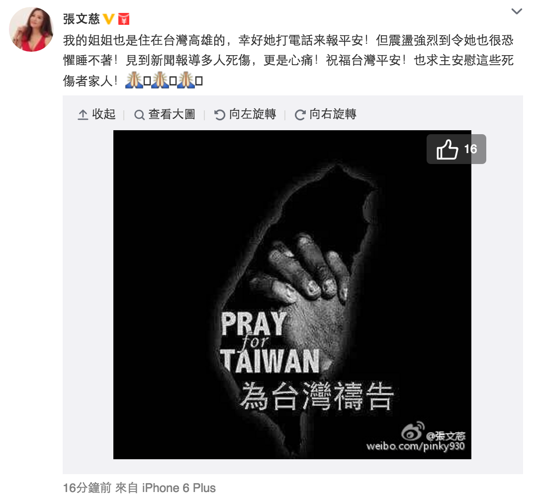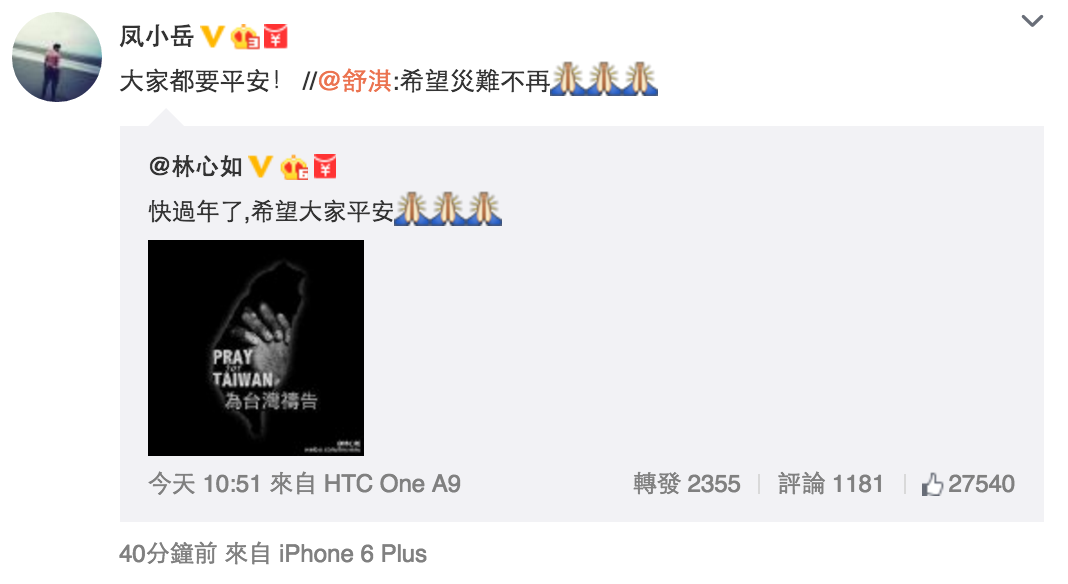 台灣女星林心如就在微博上載為台灣禱告的相片,舒淇及台灣男星鳳小岳都紛紛轉發。(微博截圖)