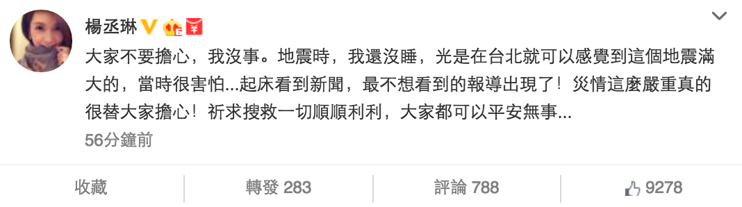 歌手楊丞琳都在微博同大家報平安,身在台北的她表示地震時間仍然未睡,她說:「大家不要擔心,我沒事。地震時,我還沒睡,光是在台北就可以感覺到這個地震滿大的,當時很害怕...起床看到新聞,最不想看到的報導出現了!災情這麼嚴重真的很替大家擔心!」又希望大家都平安。不少香港藝人都趁農曆新年出外度假,區文詩(Angela)就在微博貼出同媽媽在酒店敷面膜的相片,並留言叫大家不用擔心,她說:「今早起床收到很多朋友的問候和關心,在這?跟大家報個平安。昨晚我們感到一絲絲震動,但我跟媽媽在台北一切安好,謝謝大家的關心!」她又祝願台南和高雄的朋友一切安好。