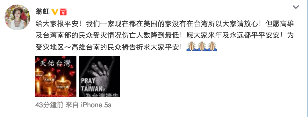 早前搬到台灣居住的香港女星翁虹,亦都在微博表示自己身在美國,又多謝大家關心。(微博截圖)