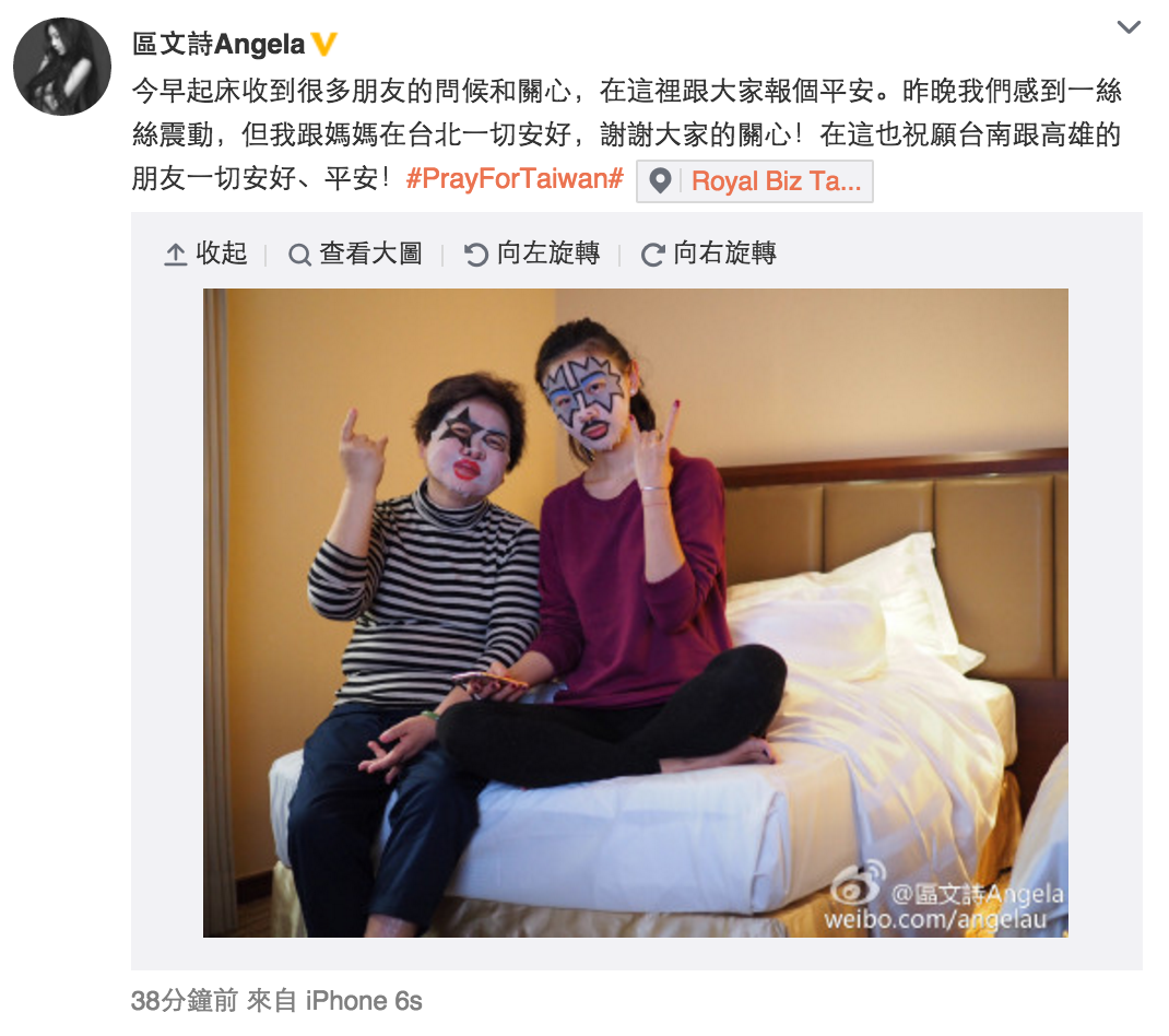 【now.com】今日凌晨台灣南部發生6.4級大地震,造成最少5死及幾十人受傷。不少中港台藝人都紛紛在微博發文及轉發相關訊息,向台灣送上祝福,其中黃曉明更與太太Angelababy(楊穎)捐款100萬人民幣(約118萬港幣)賑災。身在台北與媽媽度假的前Cookies成員區文詩(Angela)亦在微博貼相同大家報平安。