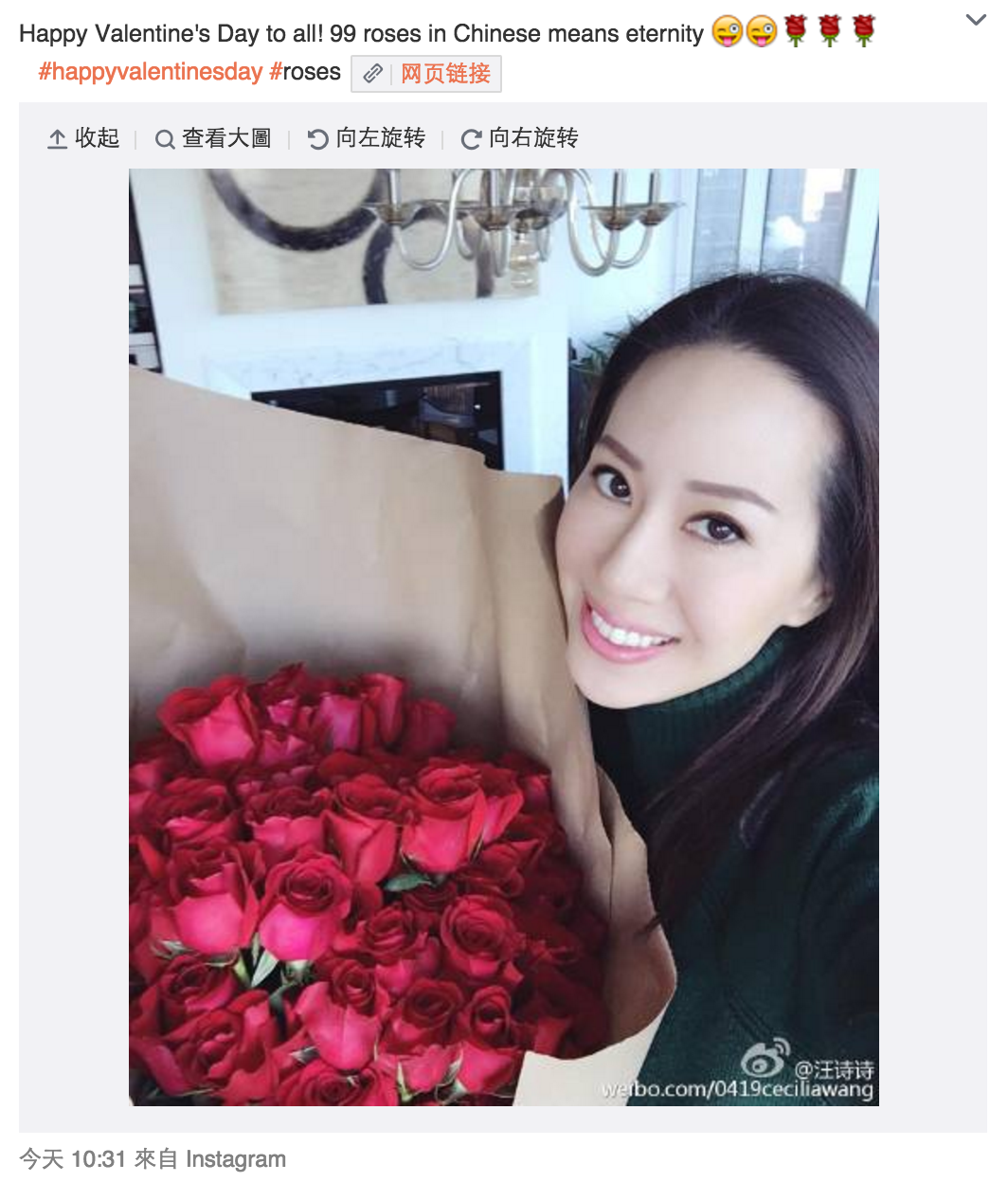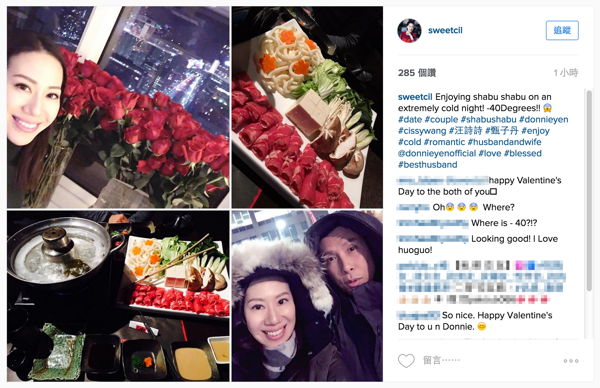 【now.com】甄子丹同老婆汪詩詩結婚多年,一向Sweet到爆,不過子丹由初三開始要離港開工,兩人早前接受傳媒訪問時又話過要第一次要分開過情人節。不過原來汪詩詩一早就飛到外地同老公一齊過節,詩詩今早就在微博晒出子丹送的99支紅玫瑰,又忍不住同玫瑰花一齊自拍,她更留言說:「Happy Valentine's Day to all! 99 roses in Chinese means eternity(祝所有人情人節快樂!99支玫瑰花代表永恆的愛。)」兩公婆又齊齊在寒冷天氣中食Shabu Shabu,詩詩更將99支玫瑰花插滿酒店房內,不少Fans都留言大表羨慕。