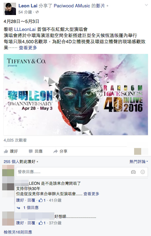 【now.com】話說黎明將於4月28日至5月3日連開六場30周年演唱會,名為《Random Love Songs 4D in Live 2016》,演唱會名真係好Leon,因為佢份人夠晒random,既創新,又夠膽死,完全令人捉摸唔到,在中環海濱搭棚搞演唱會喎,有人估到咩?