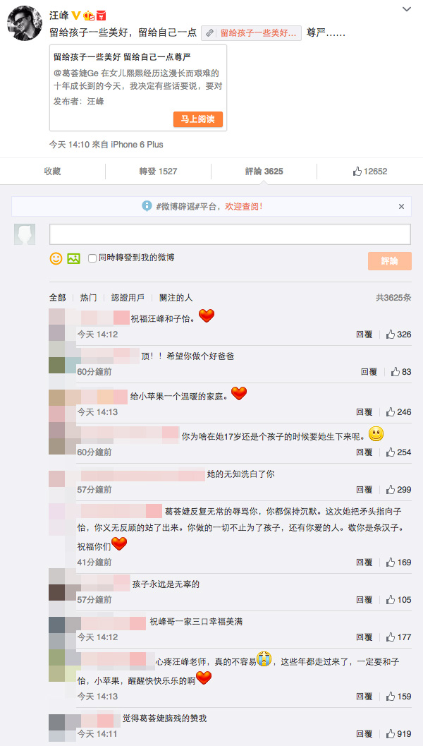 最後,汪峰向葛薈婕承諾自己過去、現在和未來都不再會對葛薈婕做出無端的傷害,更希望葛薈婕重拾善意,早日找到自己幸福。汪峰又不希望大家不停來來回回的吵鬧,他說:「今天在這裡不是對你開砲,不是傷害和攻擊,更不是現在形容吵架你來我回的『撕逼』,而是對你說幾句不得不說的肺腑之言。請留給孩子一些美好,留給自己一點尊嚴。」汪峰又強調永遠不要再傷害家人,又話「所有今天對你的話語,是第一次,也是最後一次!」長文一出,不少網友都大讚汪峰好男人,又希望「小蘋果」有溫暖的家庭。