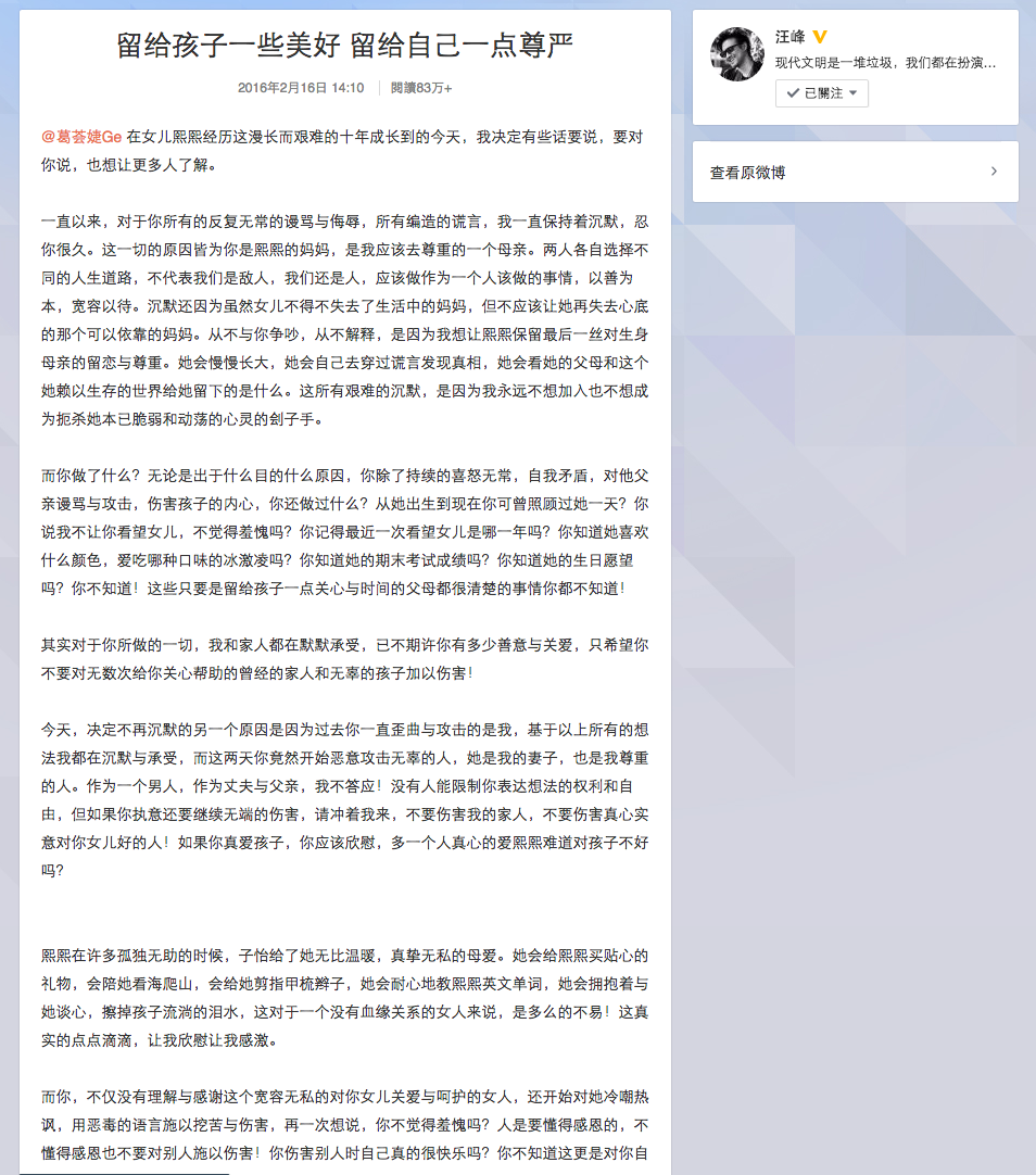 於這篇1300多字的微博中,由汪峰的用字就見得出非常憤怒。汪峰文章開首說出一直以來都不與葛薈婕爭吵,是因為要保留「小蘋果」熙熙對親生母親的尊重和留戀,汪峰又在文中以多句反問句罵葛薈婕根本不了解熙熙,又罵葛薈婕根本不關心女兒的任何事情:「從她出生到現在你可曾照顧過她一天?你說我不讓你看望女兒,不覺得羞愧嗎?你記得最近一次看望女兒是哪一年嗎?你知道她喜歡什麼顏色,愛吃哪種口味的冰淇淋嗎?你知道她的期末考試成績嗎?你知道她的生日願望嗎?你不知道!這些只要是留給孩子一點關心與時間的父母都很清楚的事情你都不知道!」又話自己和家人一直都默默承受傷害,但因為今次攻擊和傷害波及家人,所以才會發聲。