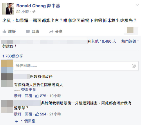 如果說香港已失去言論自由的話,實在是放屁,你看梁議員這番話,在欠缺基本邏輯和常識下都可以公開發表而不臉紅,你便感受到香港正享有前所未有的言論自由,大個大個屁從口中放出也無傷大雅。既然有言論自由,自然可接受反對聲音的扣殺攻擊,「暴龍哥」鄭中基得知這建議後,立即在facebook反問︰「老鼠,如果露一露面都算出席?咁喺你面前揚下啲錢係咪算出咗糧先?」一句便成功堵塞在排出臭氣的渠口,功效顯著。如果你係老闆,有個員工返工最大嘅心願就係可以放心射波,咁你炒唔炒?炒,一定炒啦!咁各位當日俾票送佢上區議會的黃埔區街坊老闆們,你而家知自己請咗個咩員工幫你打工啦?