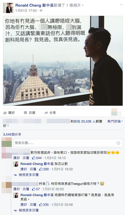 其實暴龍哥發功已不是第一次,一直以來他都路見不平,但跟黃秋生那種怒罵有點不同,他專揀發表膠論的人攻擊,而且不在乎咬文嚼字,但求好似暴龍咁一大啖咬落去求個痛快,一句直達盲腸!就好似創科局局長楊偉雄的見Steve Jobs論,暴龍哥便留言︰「你哋有冇見過一個人講嘢唔經大腦,因為佢冇腦、onX無極限、X到漏汁,又話講緊廣東話,但冇人聽得明嘅創科局局長?我見過。我真係見過。」