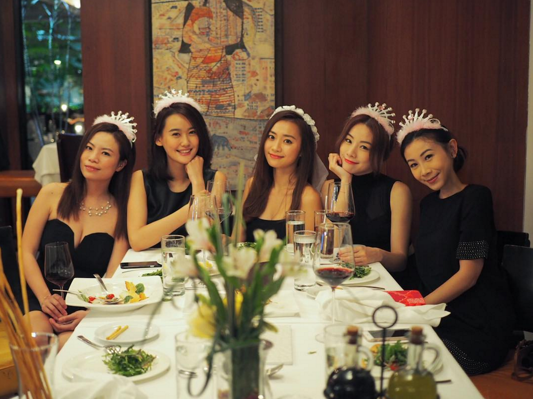 閨蜜們仲專登有一餐齊齊着上黑色晚裝、戴上粉紅色頭飾,來一個小小bridal shower,準新娘Miki更戴上頭紗。網友就話畫面差少少,因為人妻吳雨霏(Kary)未有同行。