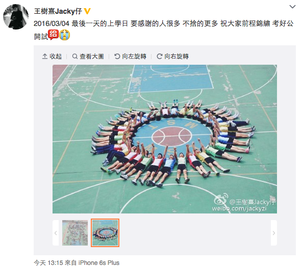 【now.com】由童星出身、有一副可愛包包面的Jacky仔(王樹熹),曾經拍過《皆大歡喜》等多套劇集,大受Fans歡迎。忙於學業的Jacky仔,眨下眼已經17歲,長得高大靚仔,今日下午Jacky仔在微博貼出兩張校園大合照,原來Jacky即將要面對大學公開試,他特意上載剛過去的星期五最後一日上學日的相片,Jacky仔更特別留言紀念話不捨得一眾同學,他說:「2016/03/04 最後一天的上學日,要感謝的人很多,不捨的更多,祝大家前程錦繡,考好公開試。」