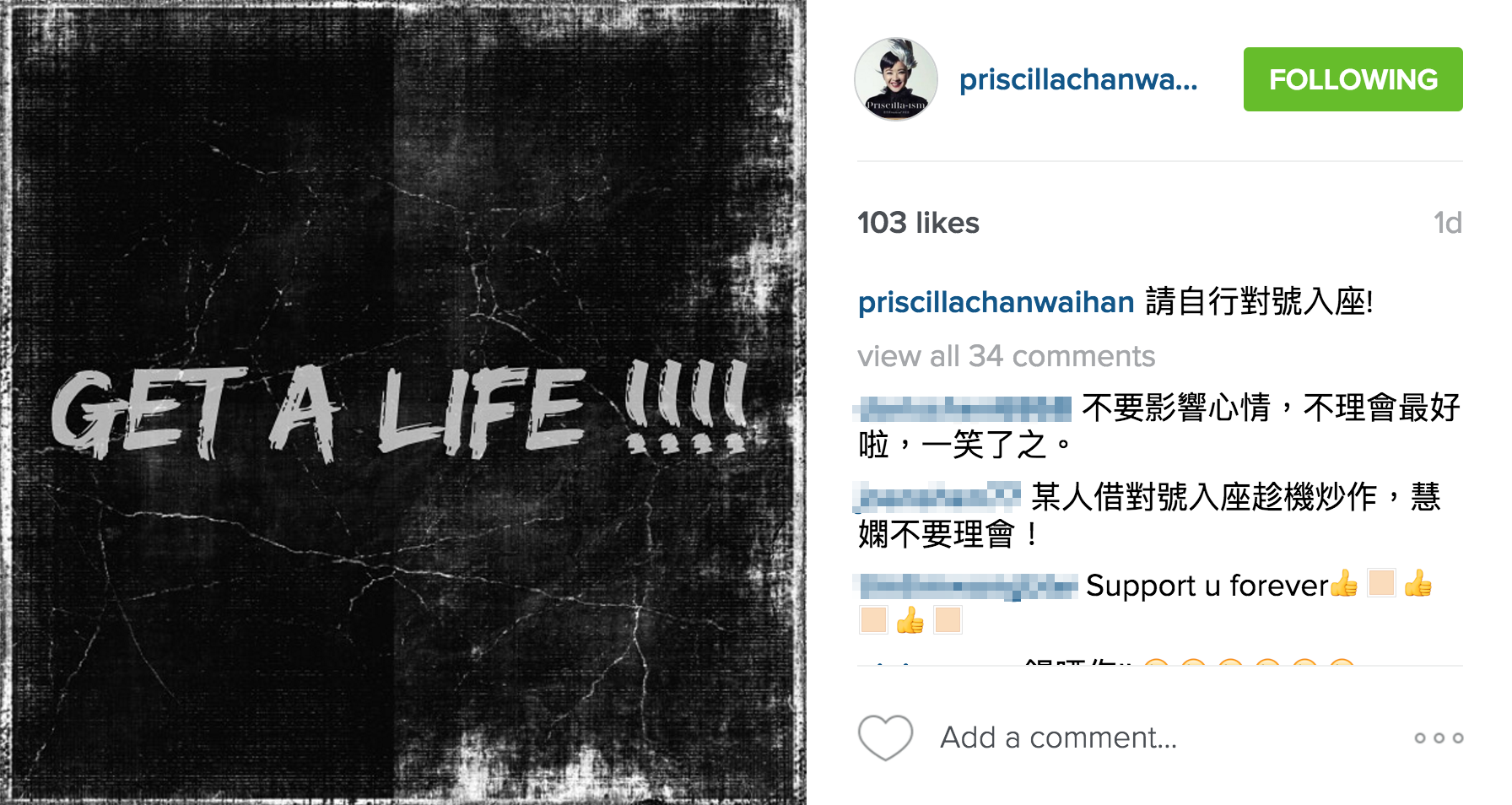 眼見是是非非,慧嫻似乎都好無奈,於Instagram貼上一張「GET A LIFE!!!!」圖,仲寫明:「請自行對號入座!」似乎想自認「Mr. One」那位快快收口。網民亦認為鄺祖德的行為唔要得,紛紛留言鬧爆:「請問妳(你)這樣說有冇考慮過慧嫻的感受?」、「你何必這樣講出來傷害她呢?為了自己炒作嗎?」、「世紀賤男!做乜抽水丫? 」