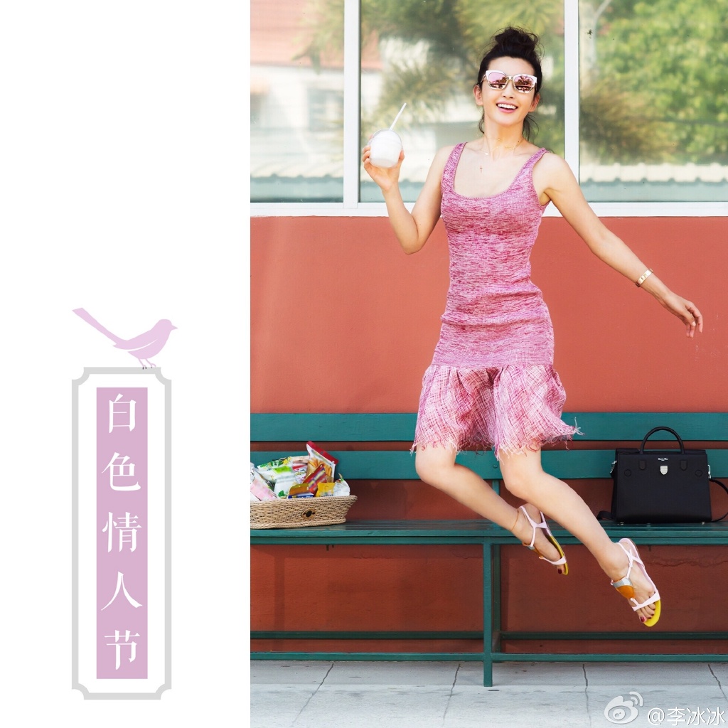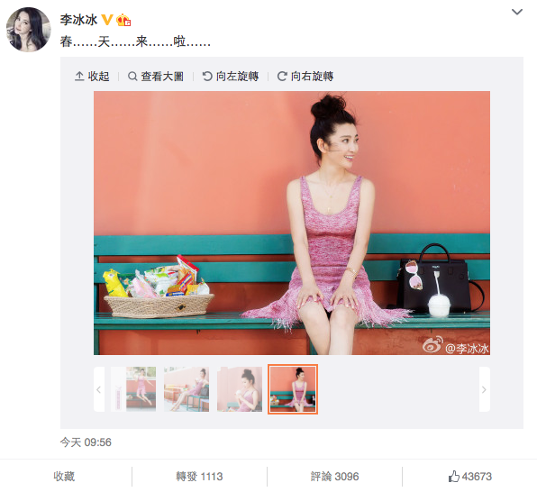 李冰冰開心指春天來啦!(微博截圖)