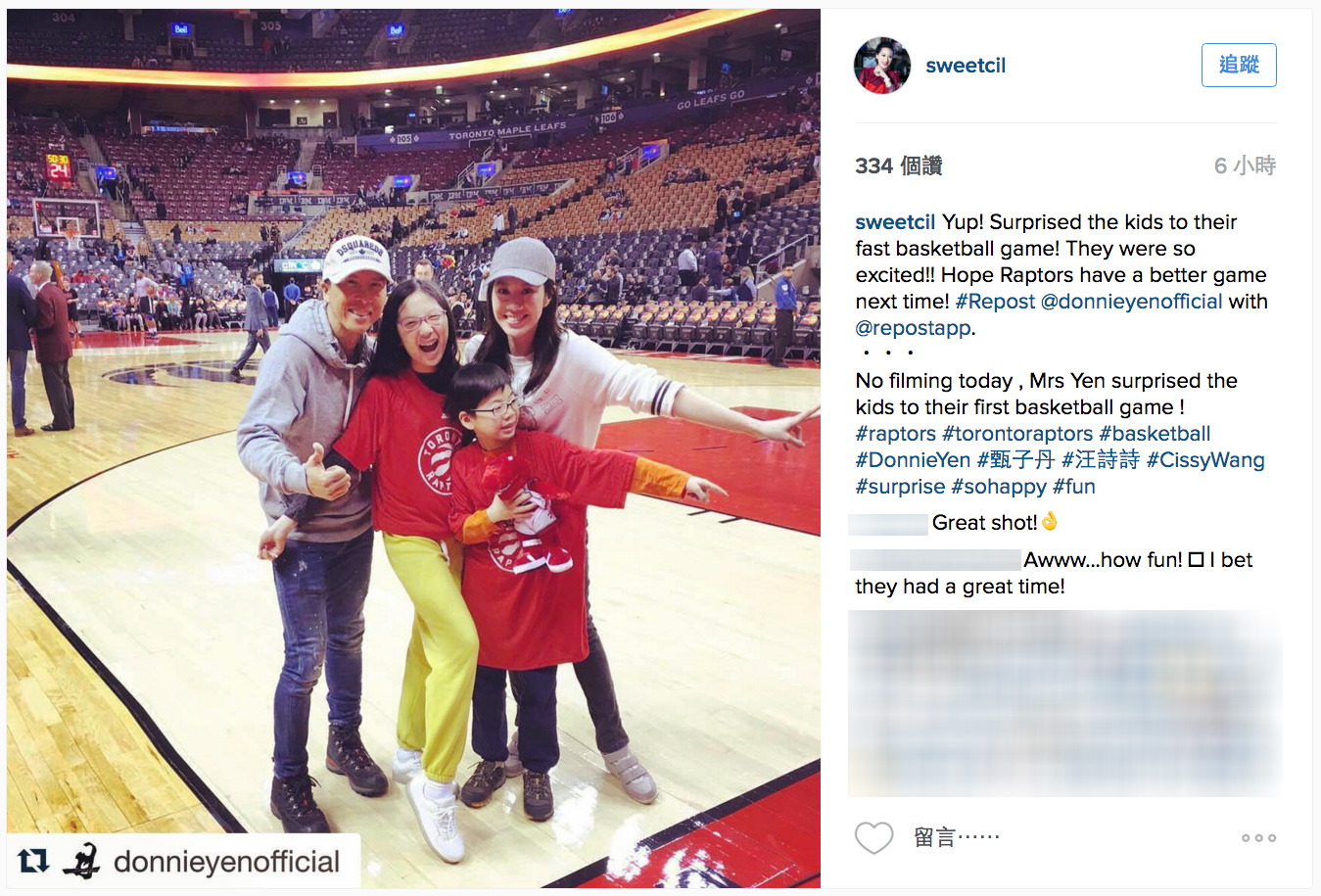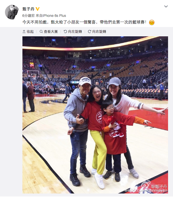 【now.com】忙於出國拍電影的「宇宙最強」甄子丹,一向疼錫一對仔女同老婆汪詩詩,早前更趁情人節大送99支紅玫瑰,Sweet爆網絡。今日上午,子丹於微博放出一家四口欣賞NBA多倫多猛龍隊(Raptors)籃球賽的相片,原來今次是一對仔女第一次近距離欣賞籃球賽,一家人都穿上運動裝睇波,四人又齊齊興奮High爆合照,子丹更留言說:「今天不用拍戲,甄太給了小朋友一個驚喜,帶他們去第一次的籃球賽!」
