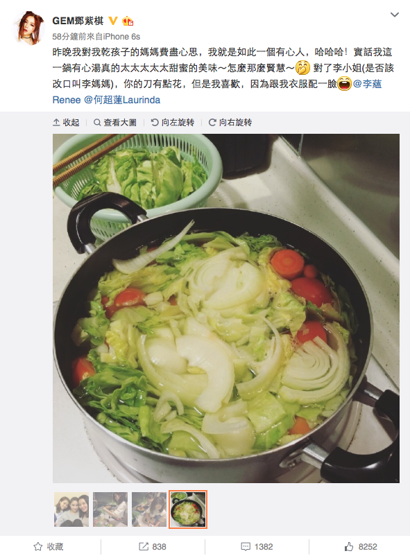 【now.com】好姊妹何超蓮、鄧紫棋(G.E.M.)同李蘊昨晚相約上李蘊屋企玩煮飯仔,同傾吓計。G.E.M.自言為陀B八個約月的李蘊費盡心思,特別奉上一煲暖暖的湯。相中所見,呢餐除了有雜菜湯仲有煎魚,係咪複雜就見仁見智,但可能因為太多菜要切,G.E.M.唔小心切到手,超蓮就即刻表示當個暫時最佳男朋友,幫忙處理傷口。