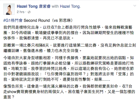 最新一集賽事由同樣是模特兒出身的唐紫睿(Hazel)和郭思琳對戰,同行如敵國,模特兒本身競爭激烈,今次走上擂台鬥過你死我活,比賽自然充滿火藥味,今日Hazel更率先在Facebook講明兩人再見不是朋友,她寫道:
