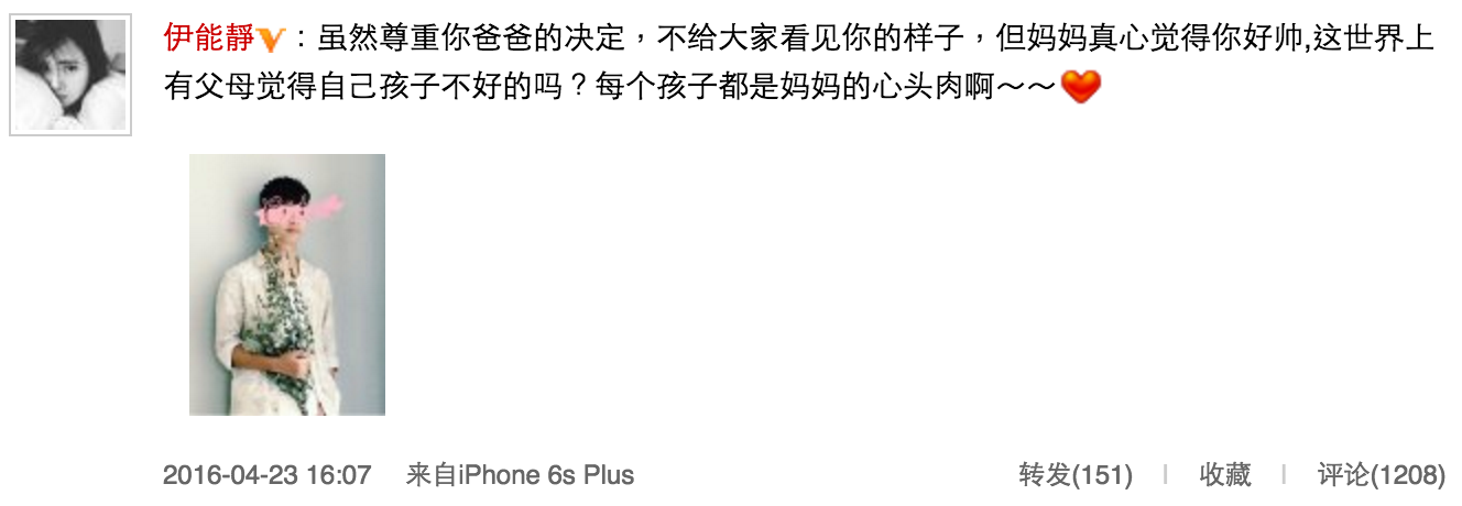 伊能靜今天下午於微博上載了3張小哈利的照片,並且留言說:「雖然尊重你爸爸的決定,不給大家看見你的樣子,但媽媽真心覺得你好帥。」伊能靜更表示每個孩子都是母親的心頭肉,言論立刻引起網友熱烈討論。今次上載的相片雖然都有用圖案遮住小哈利樣子,不過可依稀見到小哈利的容貌,不過此舉就引起部分網友不滿,話伊能靜的行為沒有尊重哈林。