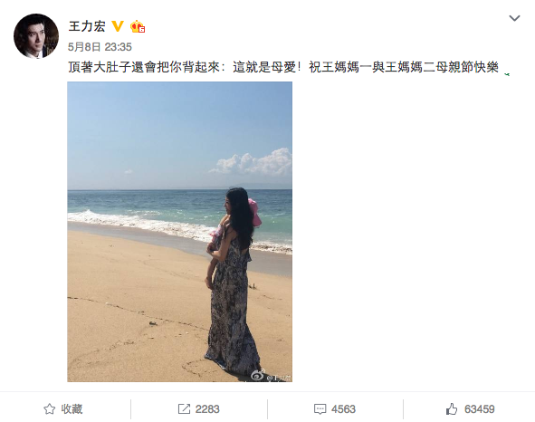 【now.com】台灣「音樂才子」王力宏(Leehom)與陀著第二胎的太太王靚蕾(原名李靚蕾),近日飛到印尼峇里參加朋友婚禮。快要變一家四口的Leehom,於剛過去的星期日趁母親節,於微博發文貼相大晒老婆富母愛一面,相中見到穿著長裙的王靚蕾在沙灘上抱著大女兒側臉而笑,Leehom又留言說:「頂著大肚子還會把你背(揹)起來,這就是母愛!祝王媽媽一與王媽媽二母親節快樂。」貼文累積過6萬網友俾Like。