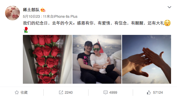章子怡公開了三張相,除了有玫瑰,還有婚戒。不過最閃的都應該係二人的合照,章子怡雖然戴上墨鏡,仍難掩滿面幸福笑容,甜蜜地依偎著老公,汪峰亦緊緊摟著她,難怪章子怡冧爆話:「我們的紀念日,去年的今天。感恩有你,有愛情,有信念,有醒醒,還有大禮」。