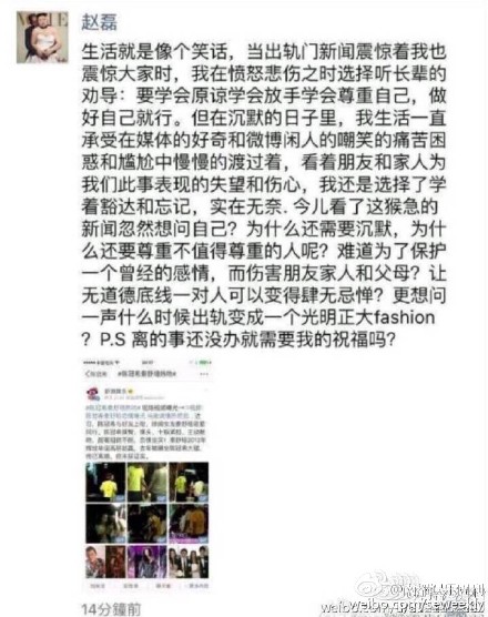 趙磊表示未與秦舒培離婚。(微博圖片)