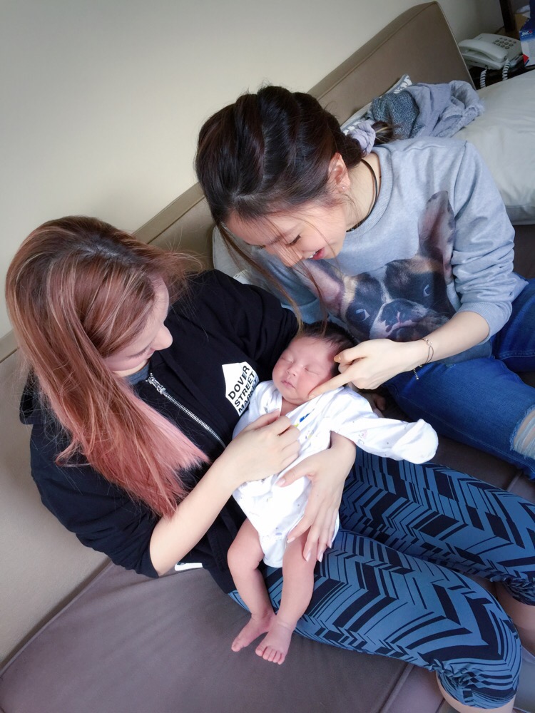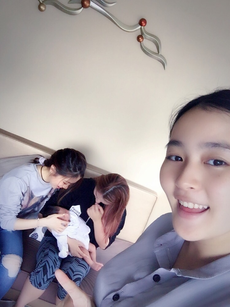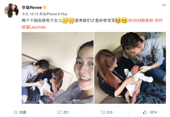 【now.com】剛剛榮升媽咪的李蘊(Renee)產後都養尊處優,留在家中照顧囡囡,不時於社交網站上載與囡囡的溫馨合照。今日下午Renee的好姊妹賭王何鴻燊千金何超蓮及G.E.M.(鄧紫棋)就齊齊去Renee屋企探訪。G.E.M.透過微博上載多張照片,見到身為囡囡契媽的G.E.M.一手抱契女入懷,手法相當純熟,及後到超蓮抱契女上手,又不時逗契女玩,G.E.M.又用手指摸契囡臉頰,相當溫馨,G.E.M.留言說:「練舞前趁午飯空檔去抱一下我的乾女兒~啊啊啊啊啊啊啊,寶貝妳太可愛了!」面對兩位好姊妹爭相抱契女玩,Renee就來一張4人自拍及留言笑兩人都忙於「研究」囡囡,她說:「兩個乾媽在研究乾女兒,原來你們才是好奇寶寶。」