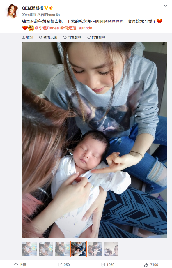 到超蓮(左)將B女抱上手,G.E.M.又忍不住摸B女臉頰。(微博圖片)