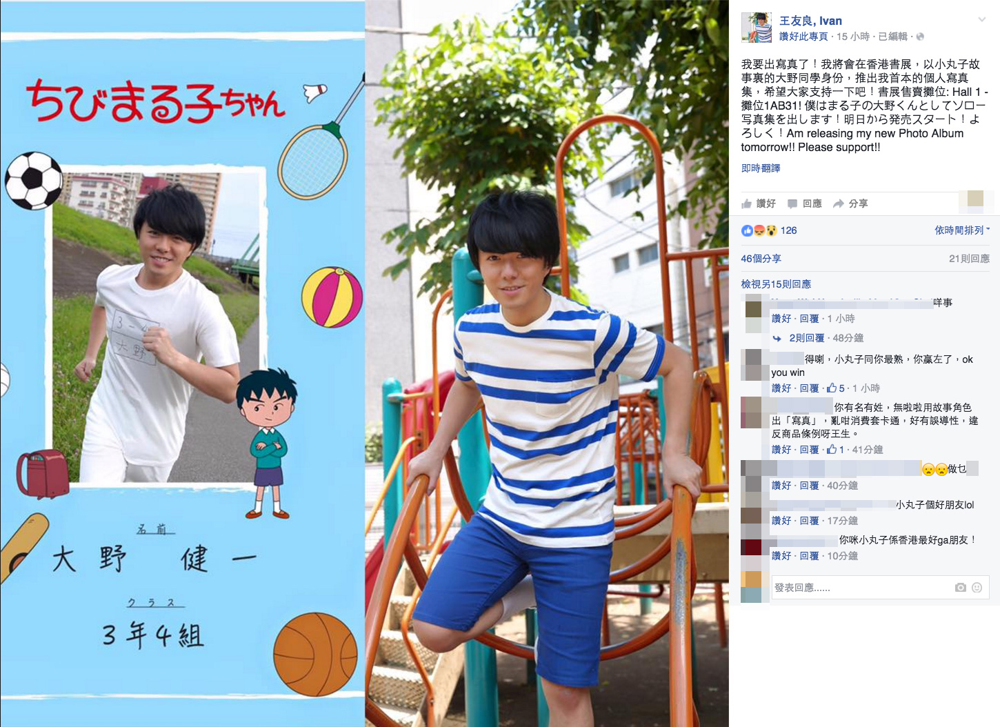 【now.com】一年一度的書展,今日於灣仔會展開幕,早上灣仔港鐵站就已經迫到水泄不通。今年書展,照樣有不少明星藝人出新書又或者寫真集。從小就是日本漫畫《櫻桃小丸子》粉絲的藝人王友良(Ivan)今年書展推出個人寫真集,今日凌晨於Facebook貼相,並謂會以故事中「大野同學」的身份出書:「我要出寫真了!我將會在香港書展,以小丸子故事裏的大野同學身份,推出我首本的個人寫真集,希望大家支持一下吧!」帖文中更附上一張有自己大頭相的小丸子漫畫中習作簿圖片,並寫上自己名字做「大野健一」。相片於Facebook貼出後隨即瘋傳,引起不少網友不滿,有網友批評「呢條友咩事?幾十歲仲扮卡通人物出寫真!」、「還真的希望看到的是你說關於小丸子故事的事而不是寫真⋯⋯」,更有網友指Ivan不用自己名字而用漫畫故事角色名出寫真,似有誤導消費者,不過Ivan就未有就留言回應。