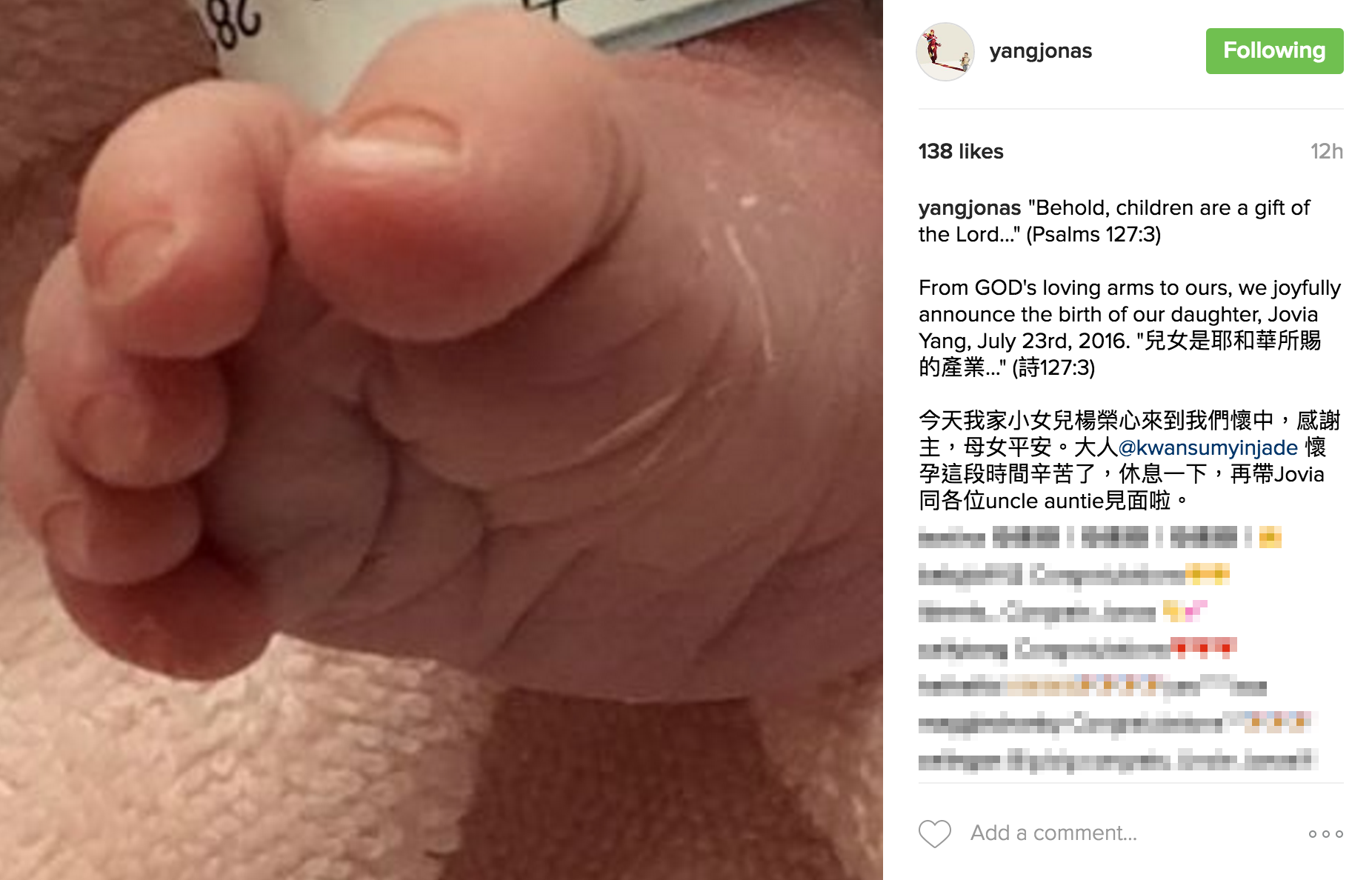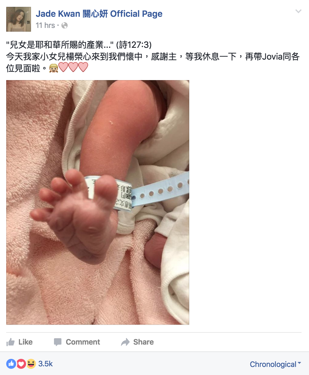 【now.com】 現年36歲的關心妍(Jade)昨晚於facebook向大家公布喜訊,就係陀了十個月的BB終於出世喇!身為基督徒的Jade先以聖經一節經文「兒女是耶和華所賜的產業」來表達自己的喜悅,再公布囡囡改名為楊榮心(Jovia)。雖然facebook只見Jovia腳仔,未有其盧山真面目,但Jade應承了休息一下就會帶埋寶貝女同大家見面。