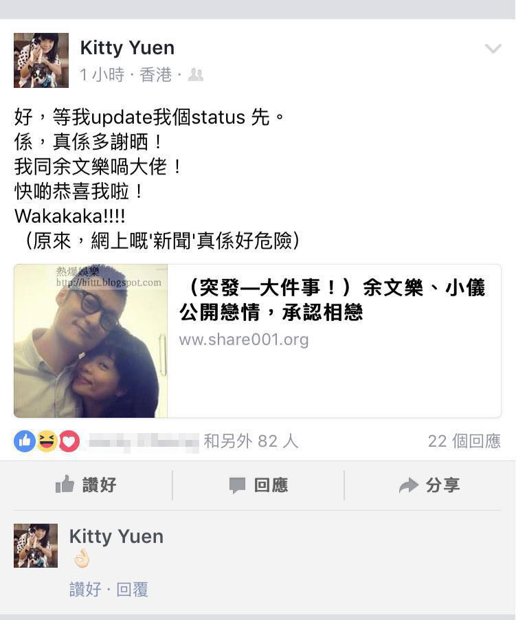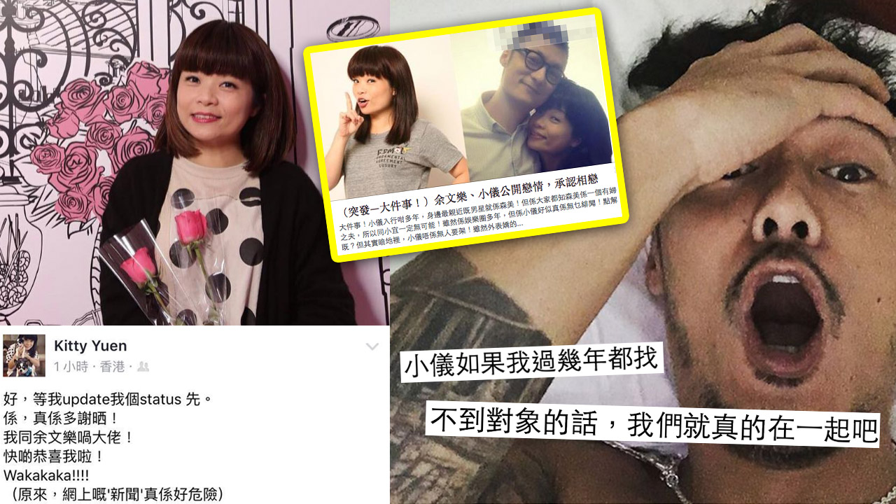 小儀就笑稱要更新Facebook的感情狀況,更叫大家送上祝賀:「好,等我update我個status先。係,真係多謝晒!我同余文樂喎大佬!快啲恭喜我啦! Wakakaka!」雖然好正面,但小儀最後都提醒大家要小心,因為網上新聞真係好危險。