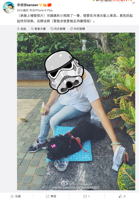 【now.com】曾經是96年港姐冠軍的李珊珊,早前話過會義賣自己港姐冠軍后冠,又有不少傳言指珊珊健康出現問題,迅即被媒體追訪,讓她承受莫大壓力。回歸平靜生活的珊珊,今日與姨甥女與及愛犬一齊到戶外玩,珊珊又同愛犬跑步。不過戶外天氣炎熱難當,珊珊只跑了一會就要休息,今日下午珊珊於微博上載了到戶外玩耍的相片,不過有一段時間沒有於公眾場合露面的珊珊,於相中以圖案遮蓋自己的容貌,珊珊更身穿牛仔褲一身Sporty,拎起風扇幫小狗散熱,相當貼心,珊珊並留言說:「姨姨和小狗跑了一會,便要在冷凍冰墊上乘涼。黑色的起起特別吸熱,沒辦法啊!」