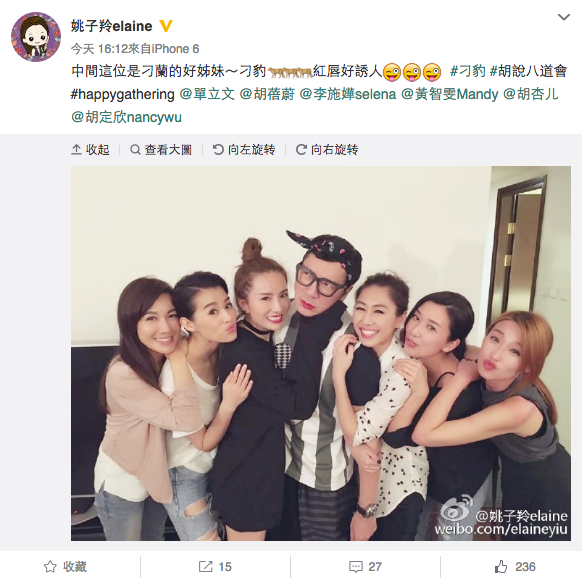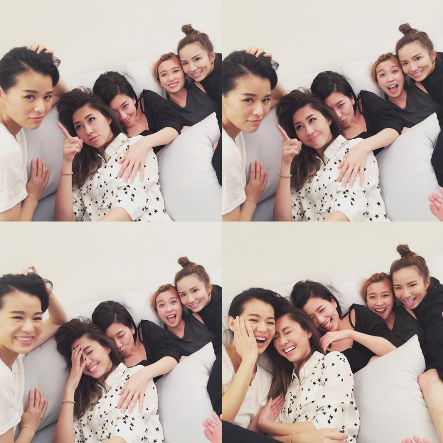 【now.com】藝人胡杏兒、胡定欣、胡蓓蔚、黃智雯、李施嬅及姚子羚組成的「胡說八道會」,6位好姊妹一有時間就相約見面聚會。胡定欣擔正的劇集《城寨英雄》於剛過去的星期日大結局,昨晚接力換上新劇《巨輪2》,「胡說八道會」大班好姊妹昨晚就齊齊相約打邊爐,又齊齊Po相同Fans分享。定欣於《城寨英雄》中「刁蘭」一角深受不少觀眾讚賞,昨晚胡杏兒等各人都參照「刁蘭」一角的造型,戴上頭巾、搽上深紅色唇膏與定欣Selfie合照,定欣昨晚更Po相到Instagram表示:「做姊妹嘅,當然係撐到底啦!」姚子羚更上載了胡蓓蔚老公單立文(豹哥)都扮成「刁蘭」的合照並笑言:「中間這位是刁蘭的好姊妹,刁豹!」更大讚豹哥造型非常誘人,不少Fans都大讚造型惹笑。
