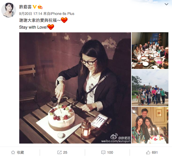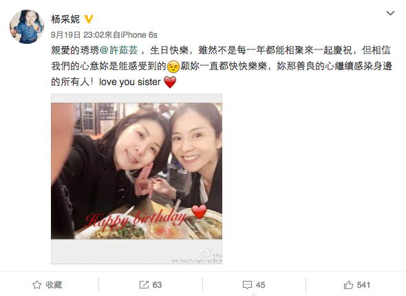 楊采妮飛台灣賀許茹芸生日 留言盼每年一起過