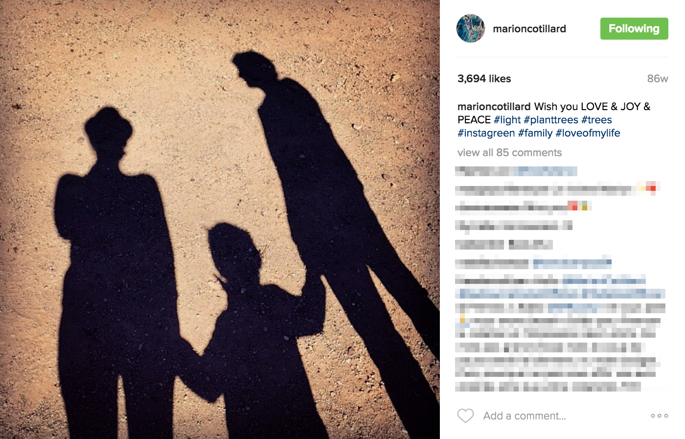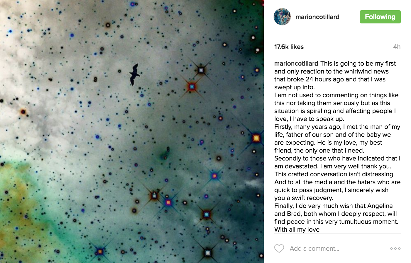 【now.com】昨日有報道指畢彼特(Brad Pitt)與安祖蓮娜祖莉(Angelina Jolie)間牽涉第三者而導致離婚,矛頭直指畢彼特新片《伴諜同盟》(Allied)拍檔法國影后瑪麗安歌迪雅(Marion Cotillard)。一日之內謠言四起,瑪麗安剛剛終於在Instagram上首度開腔回應傳聞,她更同大家公布正在懷孕的喜訊。