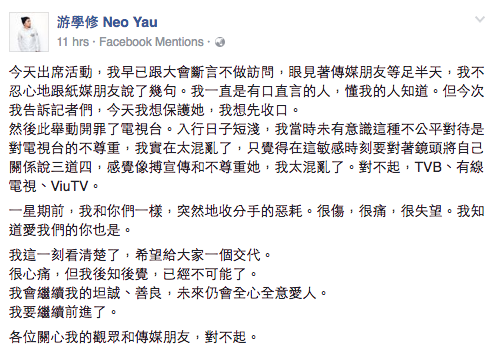 昨日游學修出席活動,自然會被追問分手一事,他事前表示不會接受訪問,後來卻只和紙媒做訪問,未有接受電子傳媒訪問,一次過得罪所有電子傳媒。