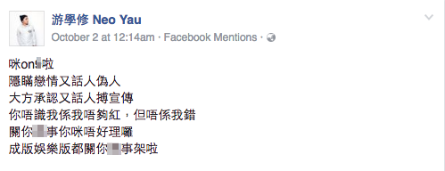 【now.com】電影《哪一天我們會飛》撮合了同是新演員的游學修和蘇麗珊,兩人經常公然曬恩愛,上月尾更一同慶祝游學修生日,豈料幾日前他在網上暗示分手,蘇麗珊透過新加盟的電影公司表示兩人處於冷靜期。由於兩人仍是新人階段,不少網民留言表示對他們分手一事不關心,甚至不認識他們。此舉觸動游學修神經,在Facebook留下爆粗晦氣字句:「你唔識我係我唔夠紅,但唔係我錯,關你X事你咪唔好理囉」