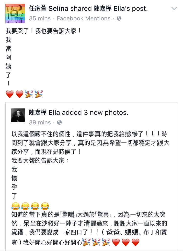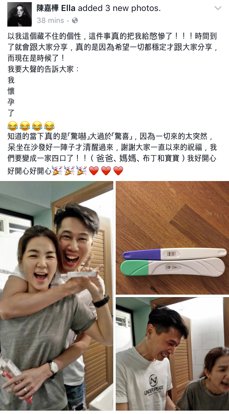 然而近日Ella就因為婉拒做烈酒代言而傳出成功懷孕的消息,當時她自己及唱片公司都沒有正面回應,只係話適時就會生。終於到了昨晚9點幾,Ella於Facebook正式晒驗孕棒,同大家公布喜訊:「我要大聲的告訴大家:我懷孕了」