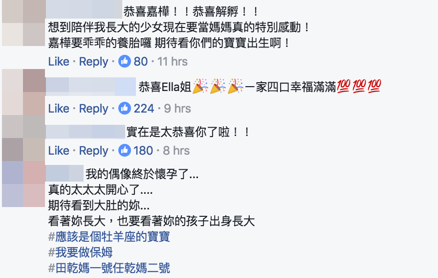 睇見Ella同老公拎著驗孕棒興奮到攬實的相片就知二人有幾開心,粉絲都紛紛送上祝福。尤其S.H.E出道已經16年多,陪伴不少人成長,能夠見證成員生B,大家都覺得好感動。