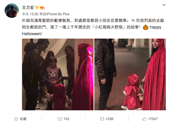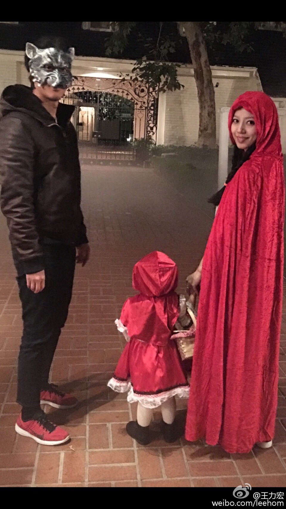 【now.com】王力宏(Leehom)同老婆王靚蕾上月誕下二女王嘉娜,一家四口Sweet Sweet。昨晚萬聖節,不少藝人都走上街頭扮鬼扮馬慶祝。今日中午即美國時間夜晚,Leehom按外國傳統,與大女王嘉莉及剛生產完的老婆到鄰居大玩「Trick or Treat」,更上載相片到社交網站。相中見到戴著豺狼面具的Leehom同披上一件紅色斗篷的老婆拖實大女,大女以一身小紅帽打扮出現,但依然見不到靚樣,一行三人到鄰居玩「Trick or Treat」攞糖吃,Leehom更留言說:「我們真的去敲陌生鄰居的門,演了一場上千年歷史的『小紅帽與大野狼』的故事!」不過今次相片焦點都集中在剛剛生產完的老婆王靚蕾,不少網友都留言大讚極速回復狀態之餘,更有網友關懷說坐月期間要注意保暖。