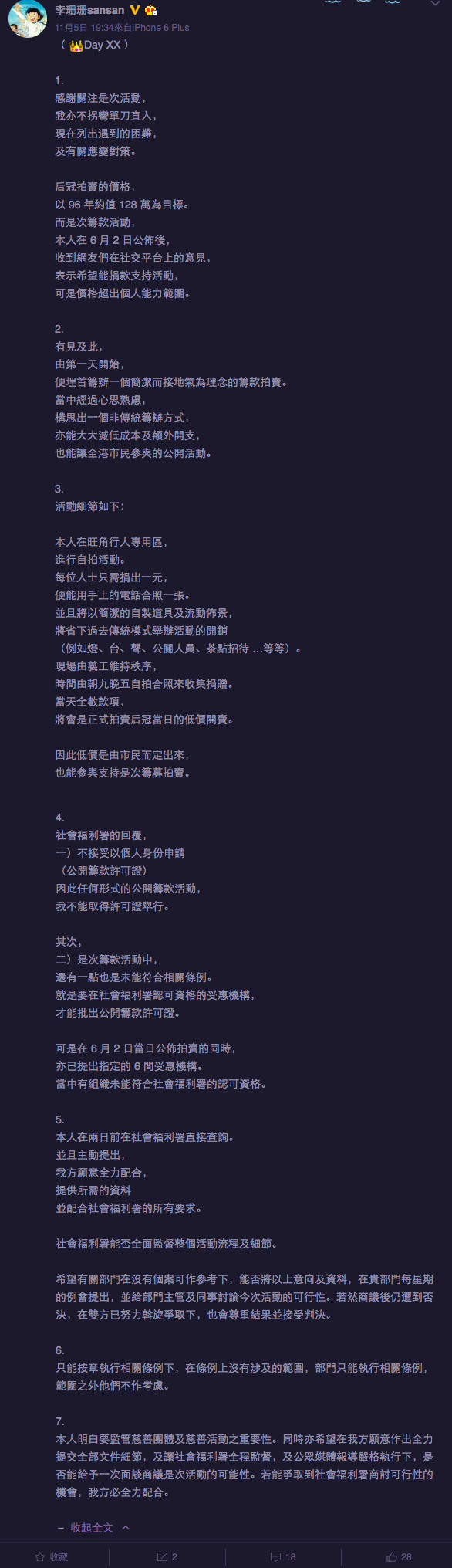 【now.com】好耐冇見嘅李珊珊最近見報,話說佢想拍賣自己嘅港姐后冠做善事,有晒全盤計劃,但結果社會福利署唔批准,最主要問題係佢唔係註冊慈善機構,一般個人申請都唔會批准。網上有唔少意見都話,其實李珊珊用自己名義拍賣后冠,然後捐錢去慈善機構咪得囉,使乜搞到咁麻煩?我覺得捐后冠拍賣到幾多錢唔係重點,重點係李珊珊想用自己方法做善事,可能佢想要個noise,令更多人效法佢咁做呢?或者佢想draw更多人關注佢個議題呢?