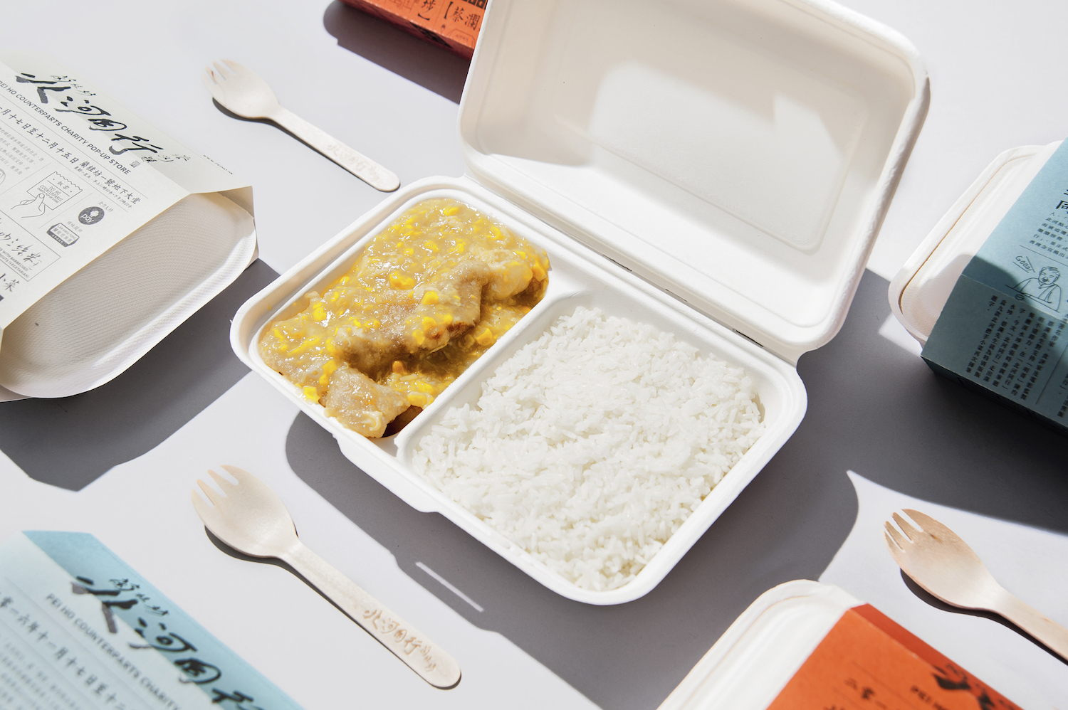 飯盒和餐叉由蔗渣物料製造,較為環保。