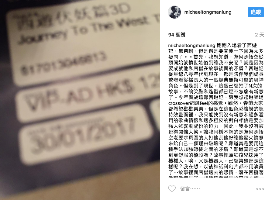 昨日唐文龍在自己Instagram,亦發表了一篇長文,藉以抒發自己在年初三看完《西遊‧伏妖篇》後的不快,除了指不明孫悟空何解全程躁狂,不時撩交打之外,更指電影淪為一齣「遊樂場crossover網遊feel」的電影,連紅孩兒一角都只是一組CG罷了。對於結局以大壓倒細的勝利描寫,更不是味兒。最後還是一則寄語,希望星爺不日重返幕前。