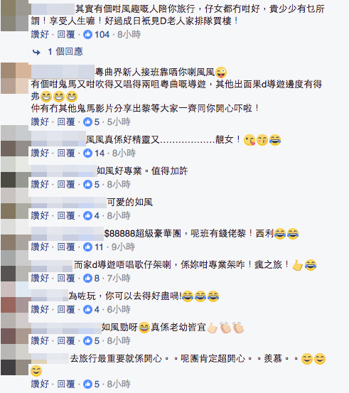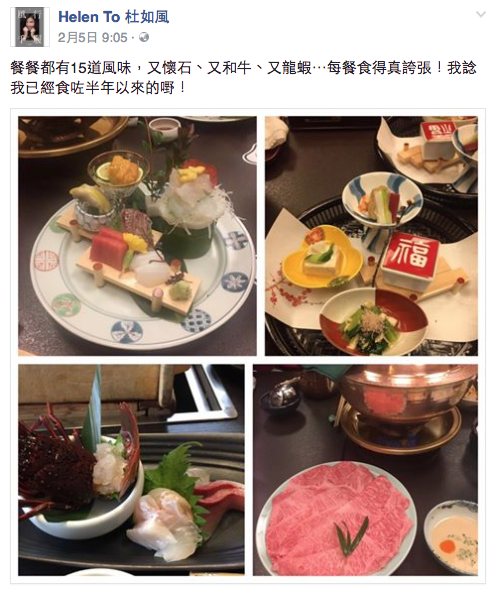 【now.com】藝人杜如風(Helen)趁農曆新年同旅遊社合作推出8萬8蚊日本豪華旅遊團,名額更一早爆滿。近日Helen於微博、Facebook等社交平台上載早前去旅行的相片。該旅行團大早已同團友商量減少景點,以行街購物為主,Helen大晒多張日本美食相片並說:「餐餐都有15道風味,又懷石、又和牛、又龍蝦⋯每餐食得真誇張!我諗我已經食咗半年以來的嘢! 」今日上午,Helen又上載了一段於旅遊車內的短片,片中Helen大唱粵曲娛賓,有份齊齊去的杜媽媽更拍晒手齊齊唱,車上的團友都紛紛舉機拍片影相,杜如風又留言解釋為何要於車內唱粵曲:「見到班團友嘅年紀都有返咁上下,所以我決定放棄唱陳奕迅嘅歌,一於唱粵曲啦!」網友看畢影片後都留言讚Helen唱得好聽,又話一定會相當開心,不過有網友就諷刺話「八萬八肯定要賣下藝」。