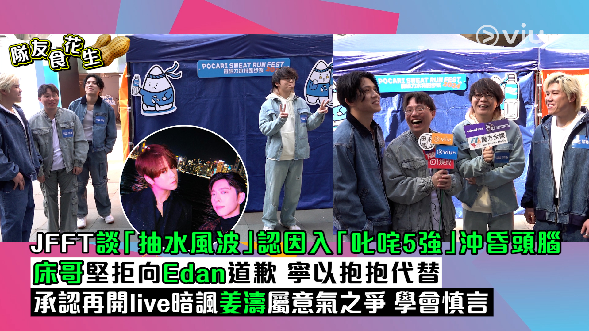 【Viu】組合JFFT自「抽水風波」後今日現身跑步活動接受訪問,床哥先透露心情,指有慢慢回復正常,覺得呢一次嘅風波係上咗一課!身邊三位兄弟幫拖同時又做「花生友」,笑指呢次係煲大咗少少,但去到年尾、特別臨近頒獎禮有noise都係件好事!風波後床哥單人嘅IG follower急升,笑話多咗人認識係不幸之中嘅大幸,四子繼而承認係因入咗叱咤我最喜愛組合5強而沖昏頭腦,呢段時間做嘅嘢都「沖」住上!