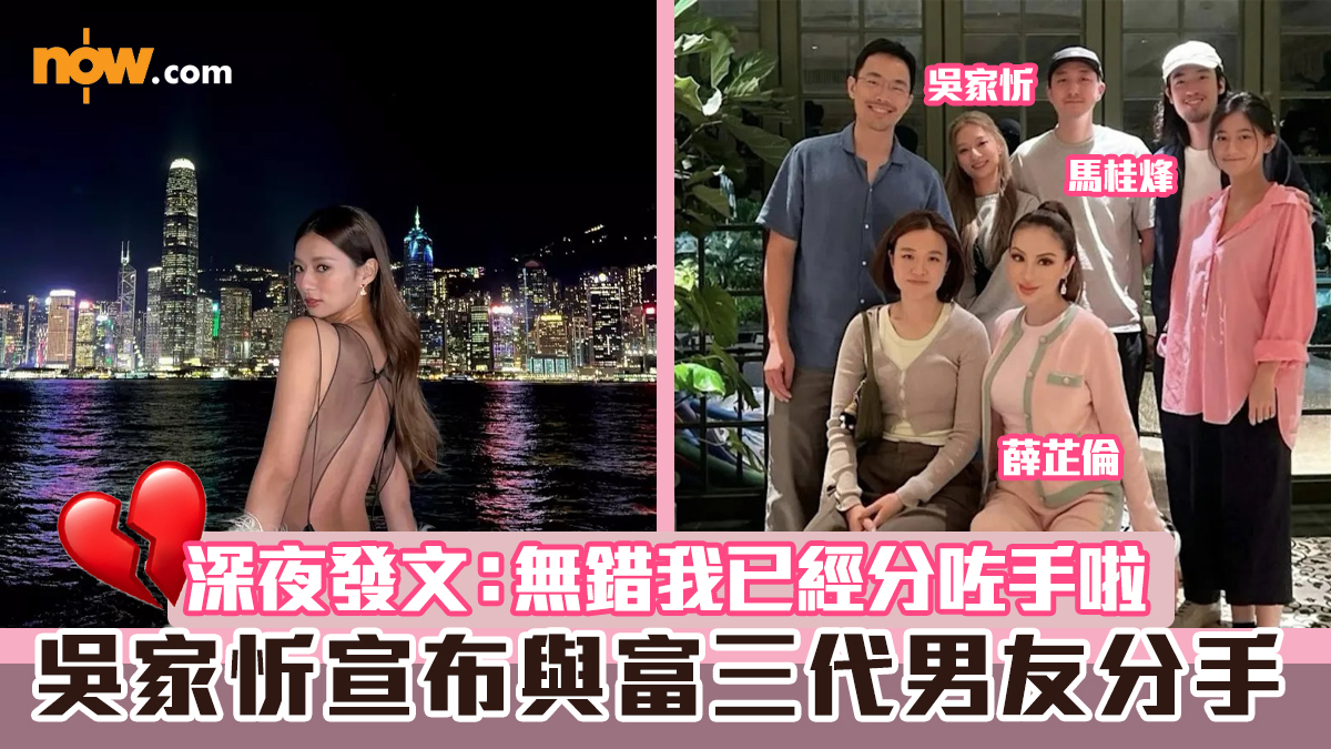 【Now.com】現年26歲的女藝人吳家忻(kayan9896)去年與Locker(林家熙)分手後,今年3月爆出與「Ball后」薛芷倫長子馬桂烽(Justin)拍拖,2人一度愛得高調,母親節時更出席男友的家庭聚會,發展順利。不過周日(22日)凌晨,吳家忻突然在社交平台宣布與富三代男友已分手!